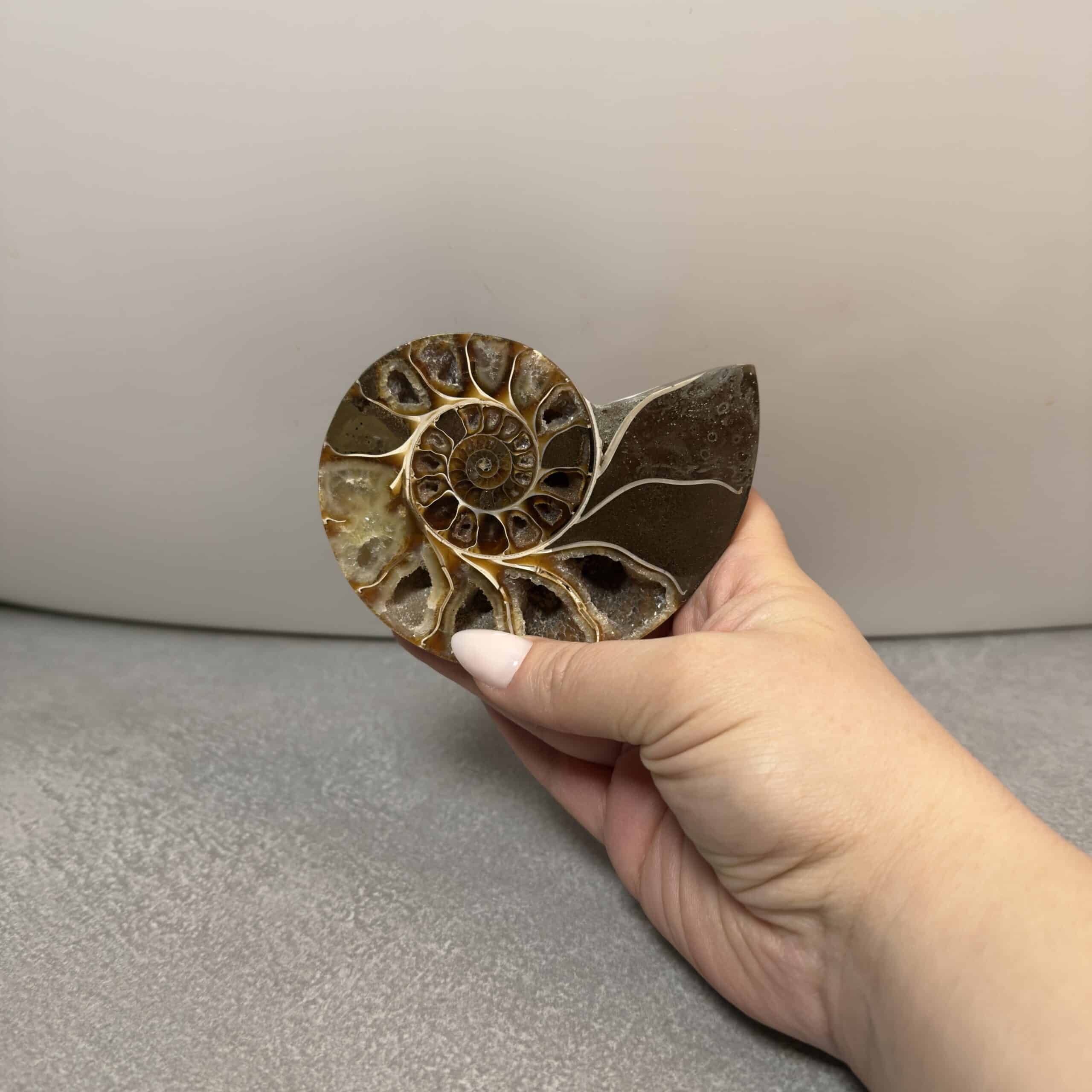 „Solaris“ bringt die ruhige Schönheit der Natur in dein Zuhause. Der kleine Ammonit besticht durch helle, warme Beigetöne und fein polierte Calcit-Einfassungen, die jede Spirale auf subtile Weise zum Leuchten bringen. Jedes Stück erzählt seine eigene Geschichte und fängt die zeitlose Eleganz fossiler Formen ein. Die Rückseite ist besonders speziell und sticht durch ihr besonderes Muster hervor.